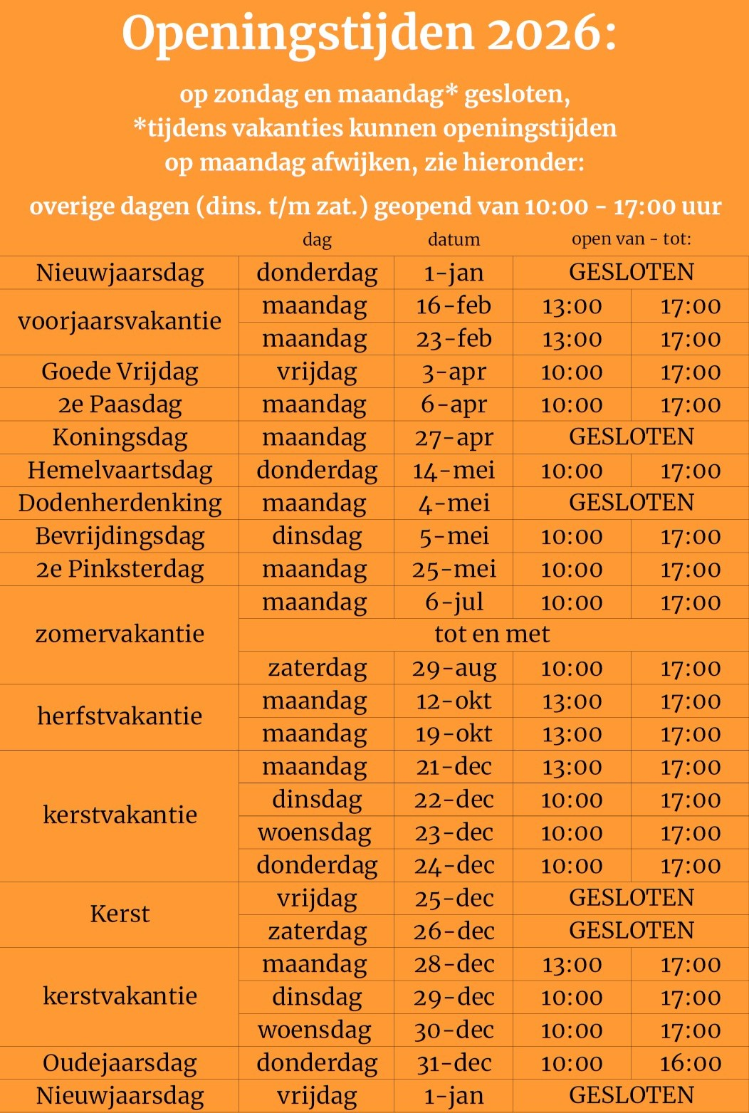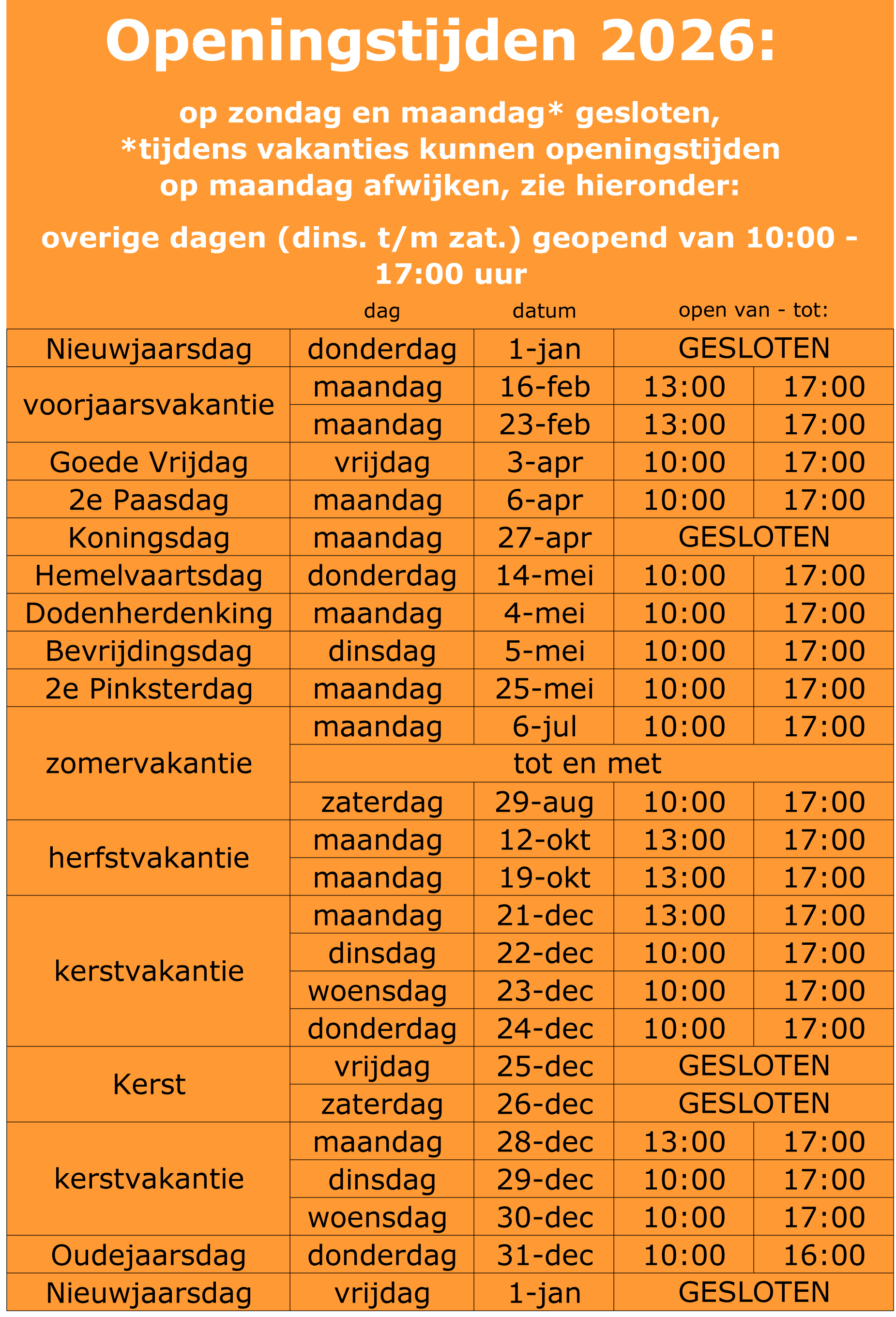 We zijn geopend van dinsdag t/m zaterdag van 10.00 – 17.00 uur. Ook open op 2e Paasdag en 2e Pinksterdag en op de maandagen in de landelijk aangegeven schoolvakanties. Gesloten op 1e en 2e Kerstdag.